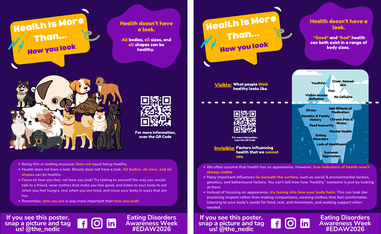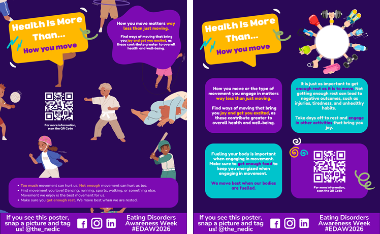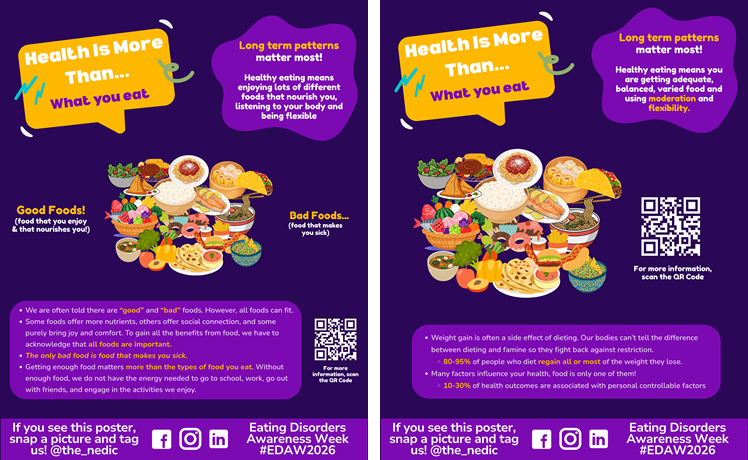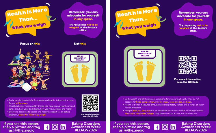 By putting up these posters in common areas – such as offices, clinics, schools, gyms, staff rooms, kitchens or anywhere people gather – you can help expand the conversation, push back against rigid beliefs about health, and build awareness in your local community.