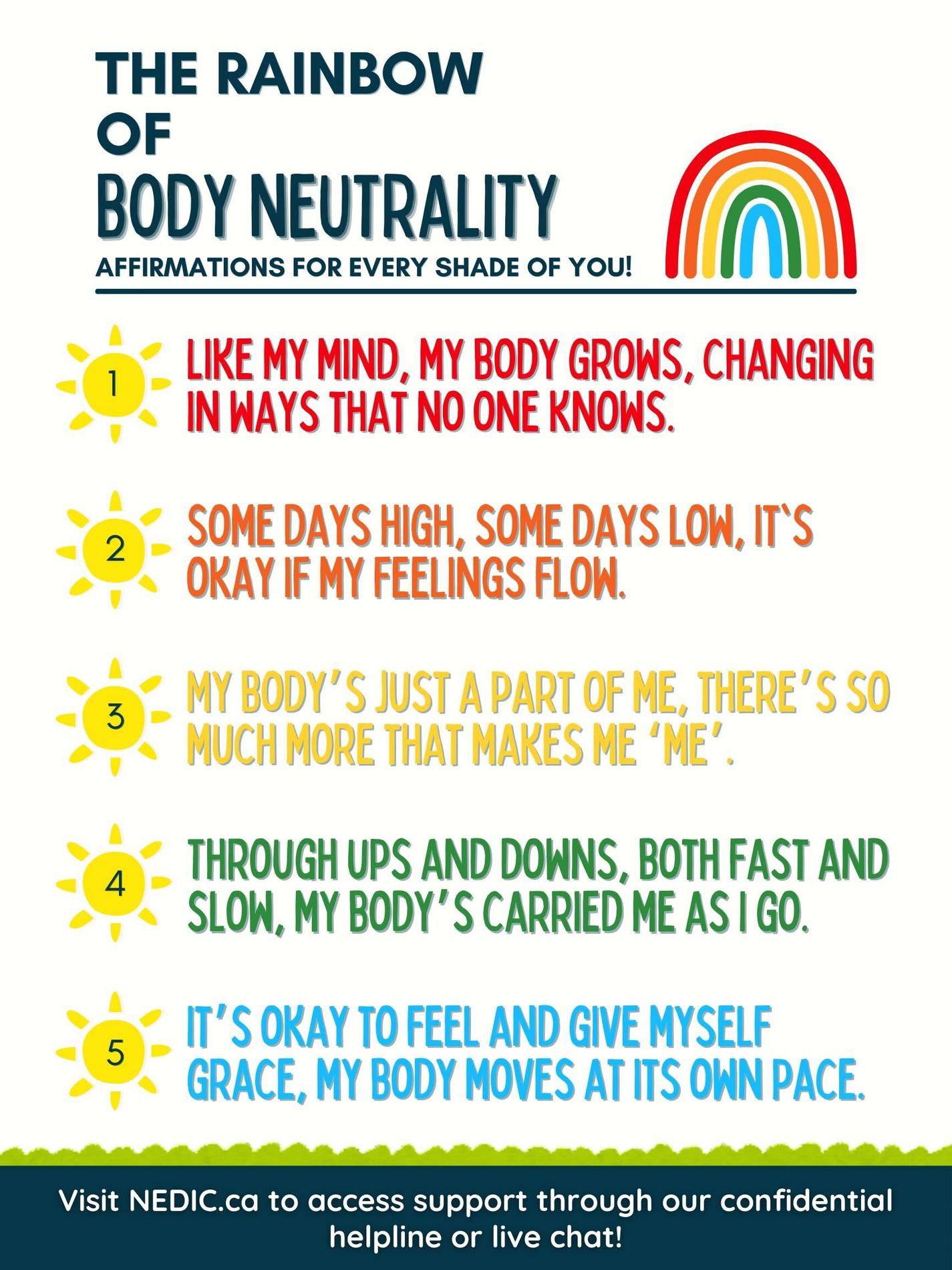 To help make these ideas tangible and age appropriate for younger students, I created the Rainbow of Body Neutrality poster. Using the rainbow as a symbol of diversity and change, each colour features an affirmation that gently supports self-acceptance through life’s physical and emotional shifts.