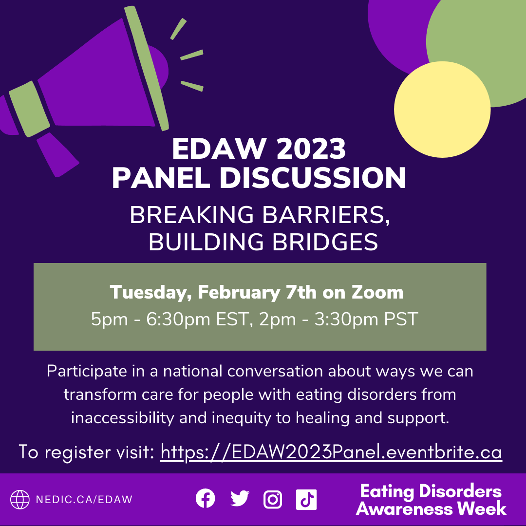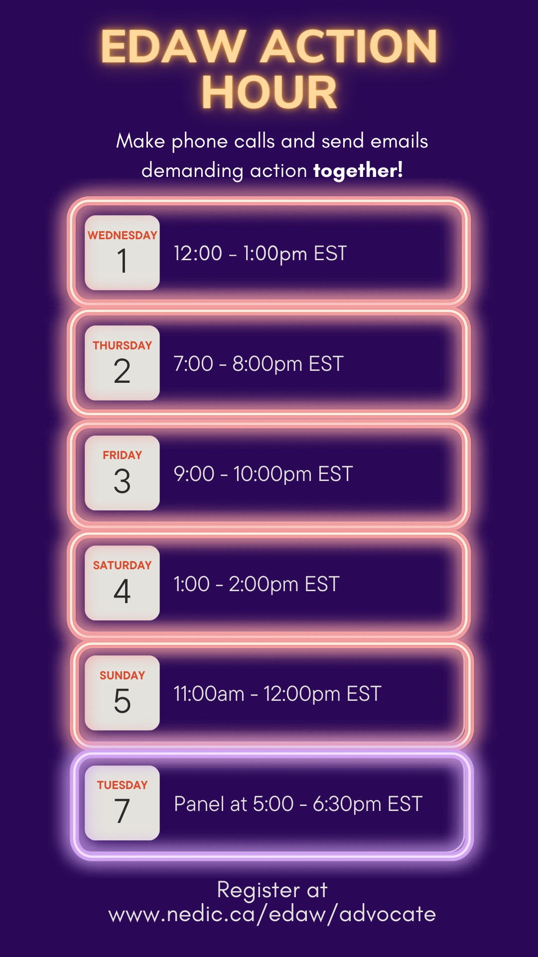 Note: Each event will follow the same structure so choose the date to attend that works best for you! The EDAW national organizing committee prioritized having a range of dates and times available to reflect the many time zones present across Canada, instead of choosing one consistent hour.