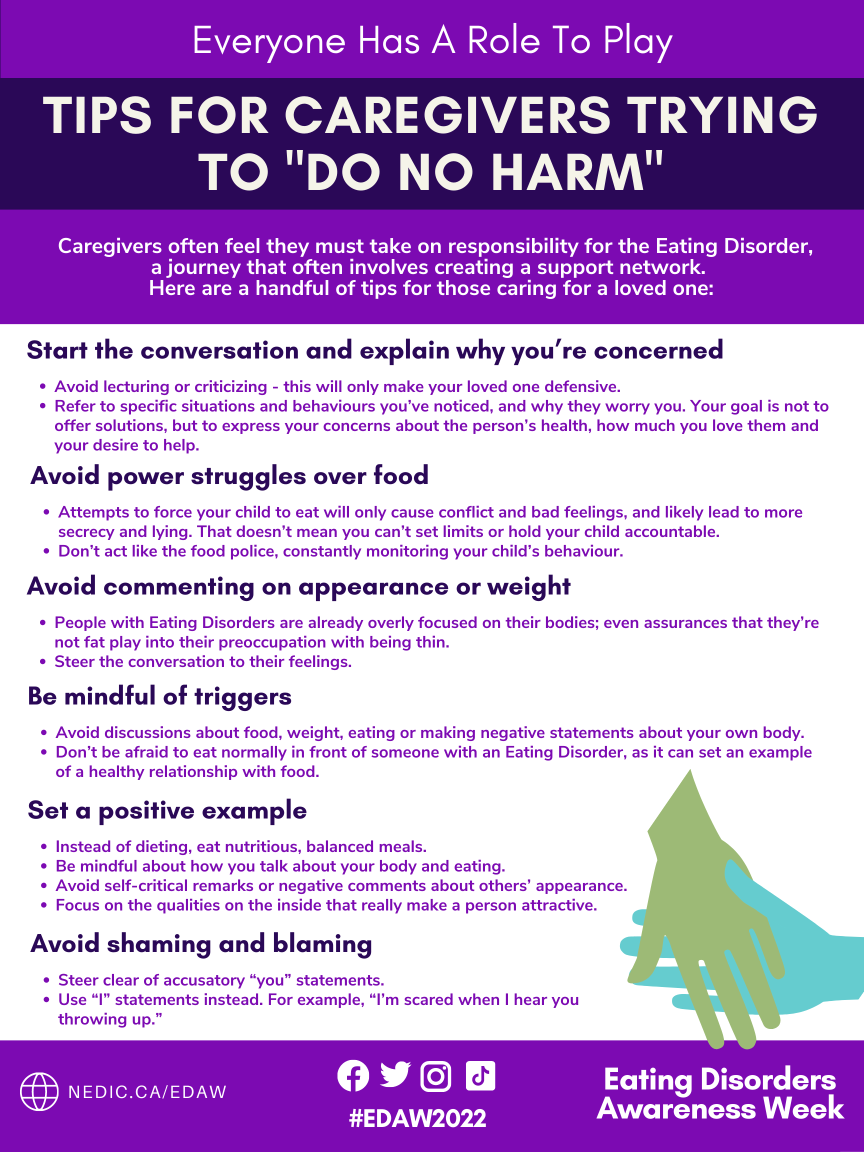Save on your phone, take a screenshot and text to a friend, or print it to pin up around you. This handy poster shares some introductory tips for you to keep in mind as you care for someone with an Eating Disorder.