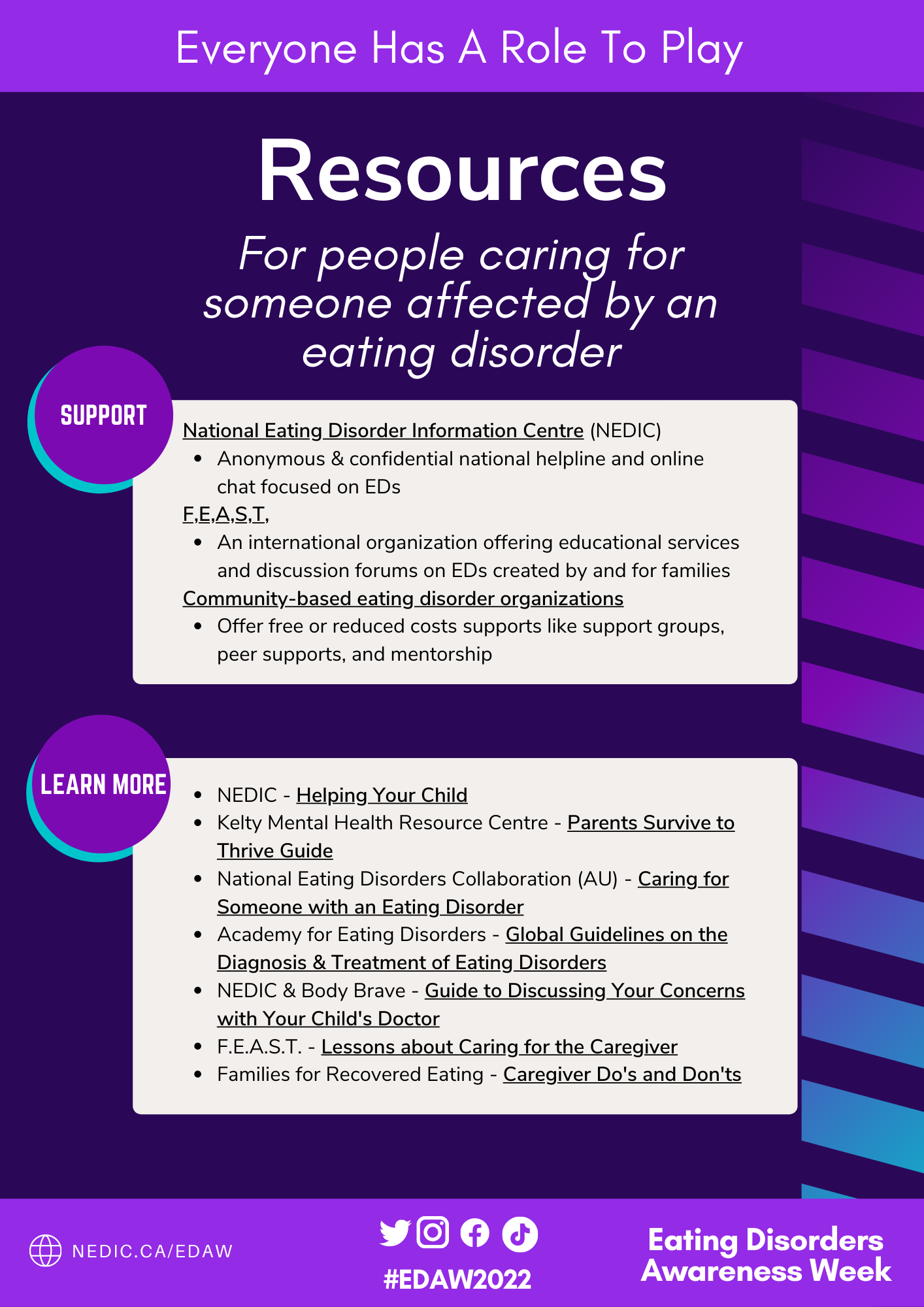 A one-page list of resources that focuses on further learning and support for caregivers looking to support someone affected by an Eating Disorder. Everyone starts somewhere! Download the PDF to access the clickable, underlined links.