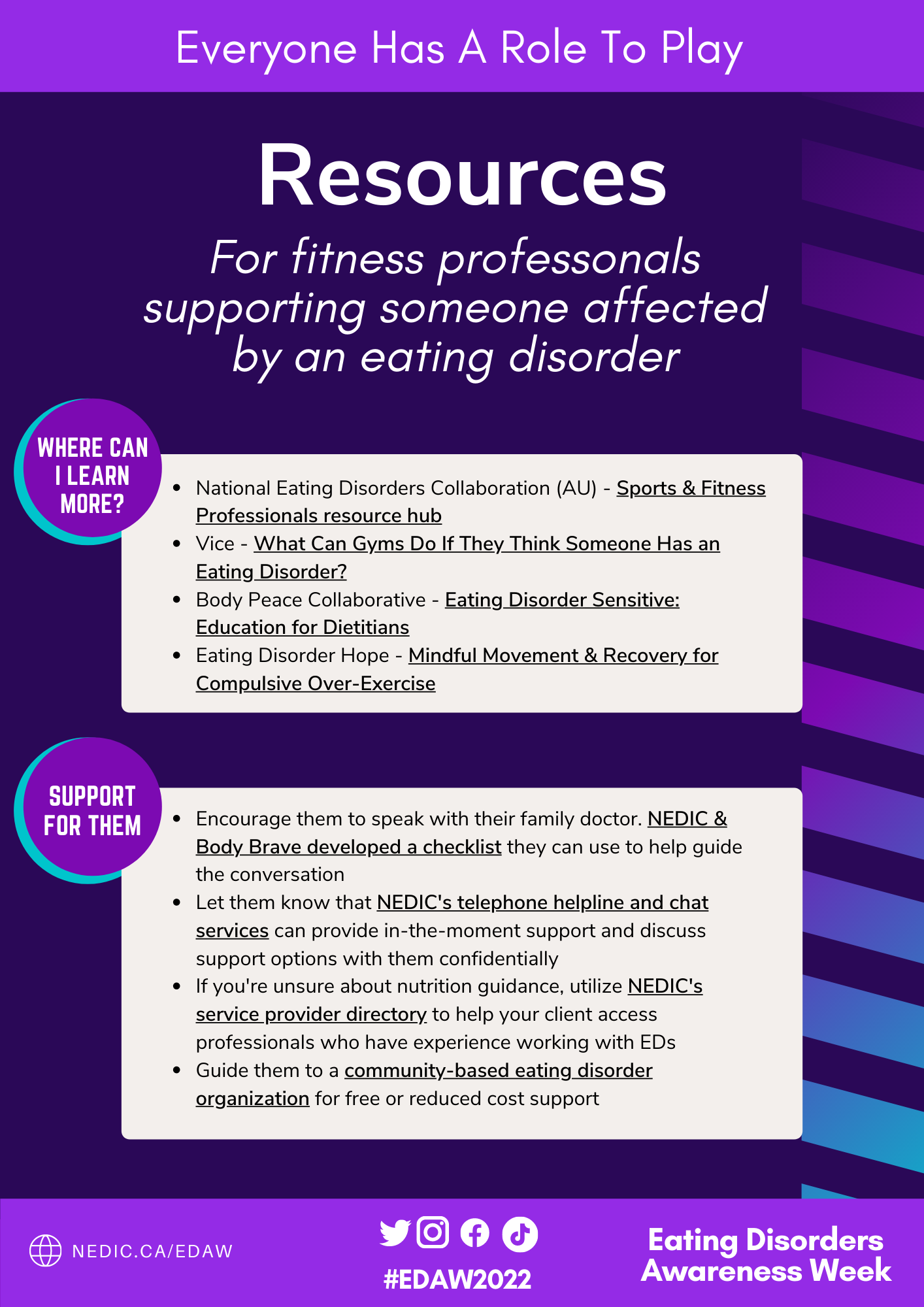 A one-page list of resources that focuses on further learning and support for fitness professionals looking to support someone affected by an Eating Disorder. Everyone starts somewhere! Download the PDF to access the clickable, underlined links.
