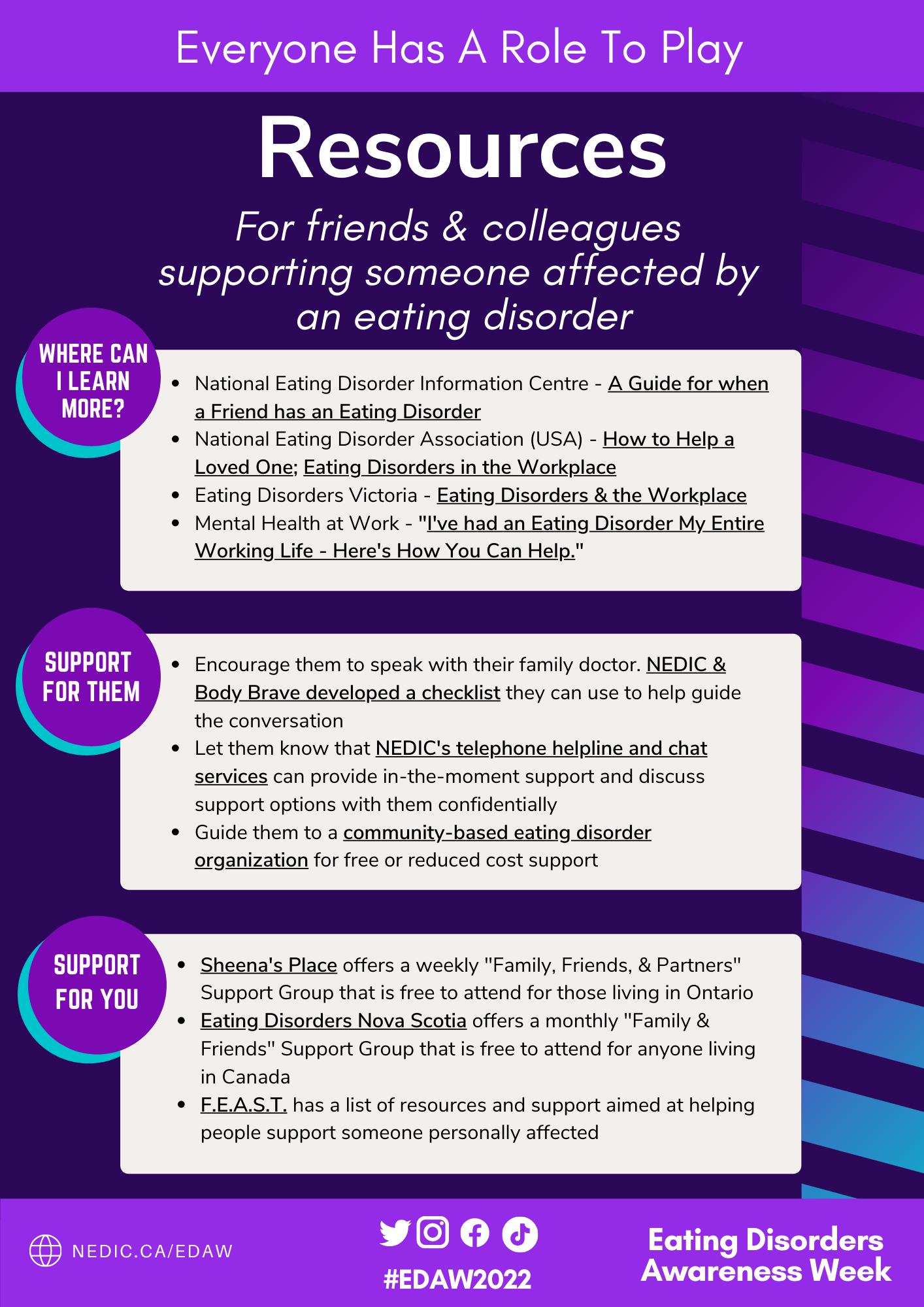 A one-page list of resources that focuses on further learning and support for friends and colleagues looking to support someone affected by an Eating Disorder. Everyone starts somewhere! Download the PDF to access the clickable, underlined links.