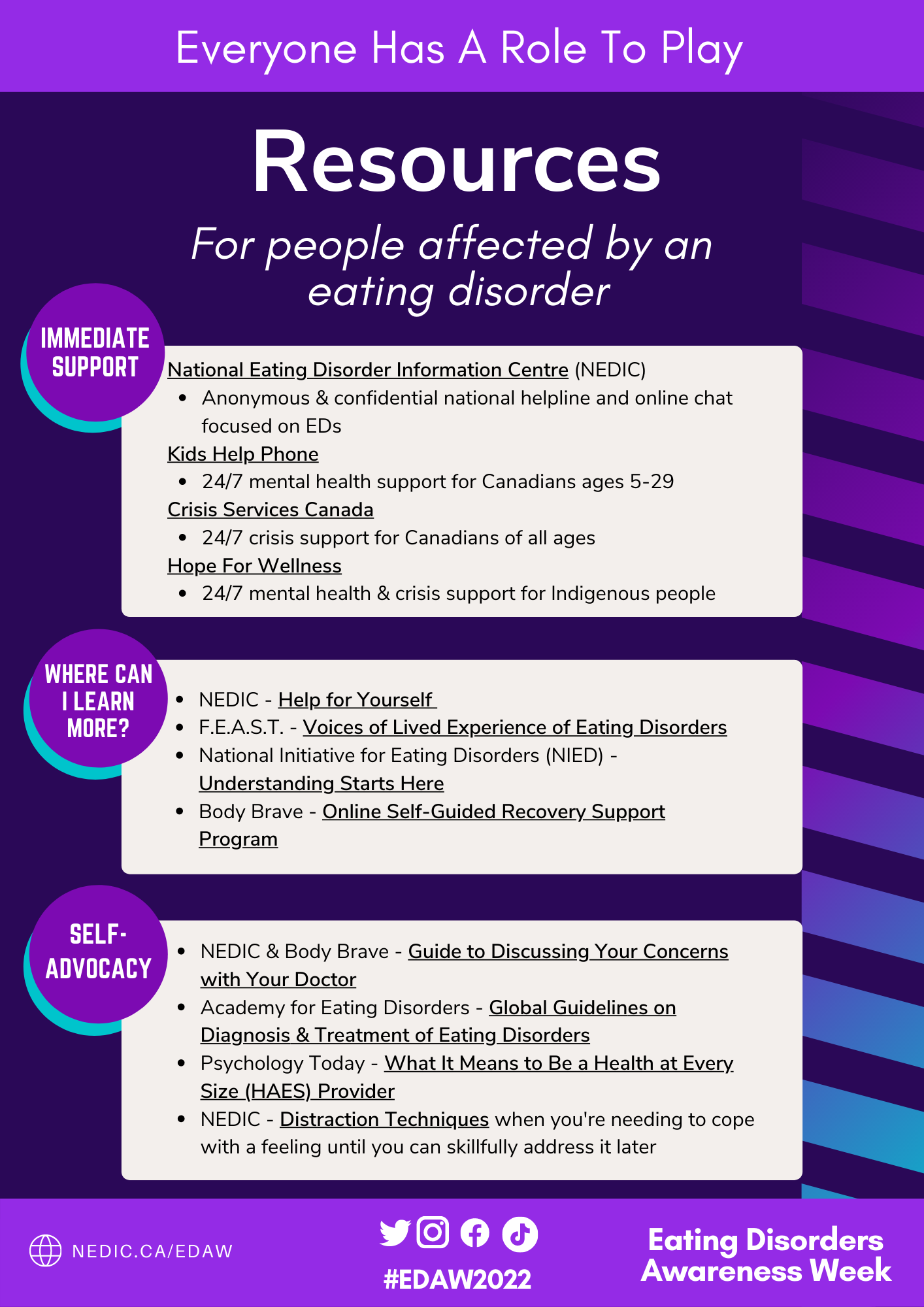 A one-page list of resources that focuses on further learning and support for people affected by an Eating Disorder. Everyone starts somewhere! Download the PDF to access the clickable, underlined links.