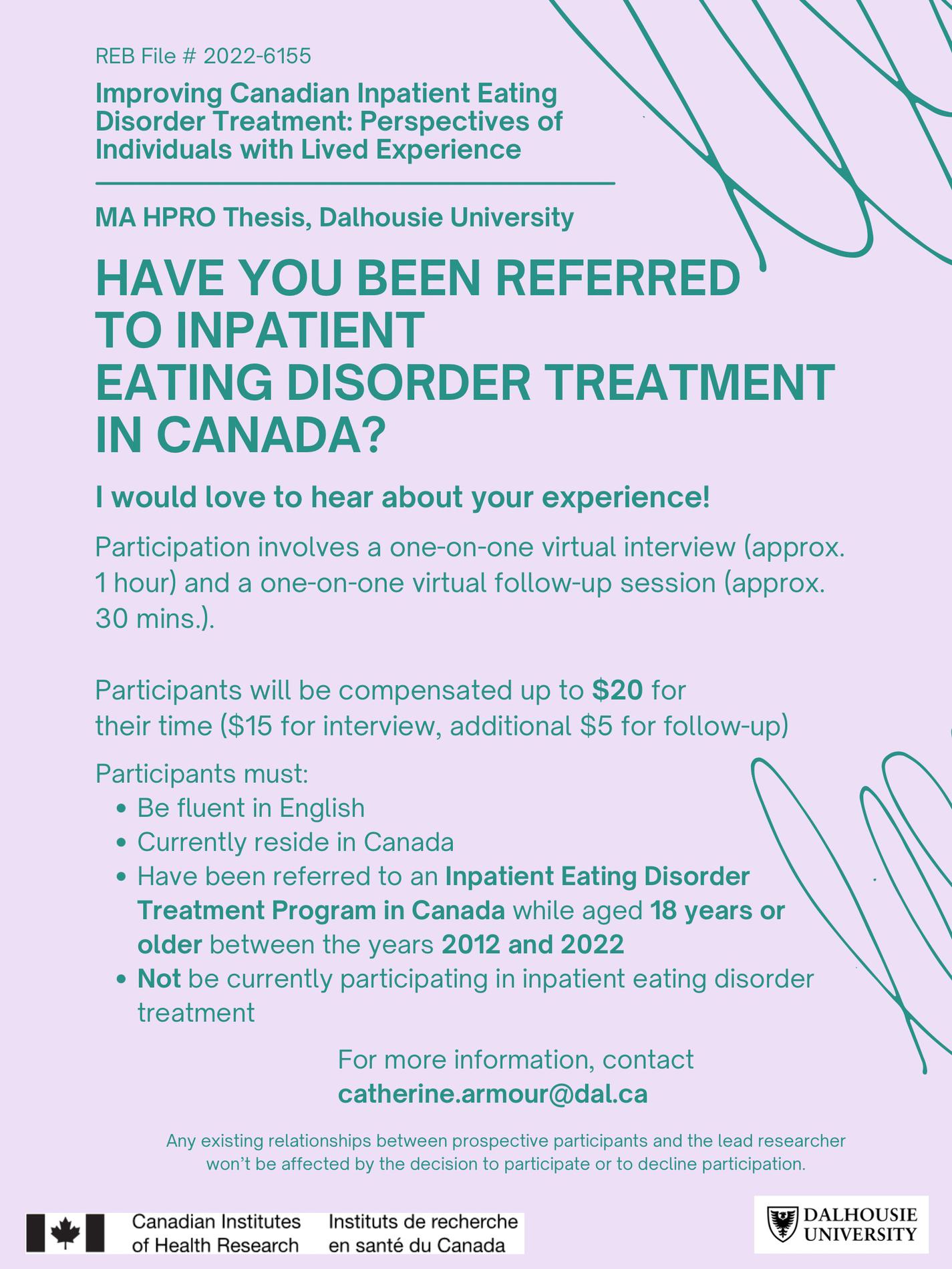 Researchers at Dalhousie University are seeking participants for a study to learn more about the experiences of individuals who have undergone inpatient eating disorder treatment in Canada. The goal is to produce recommendations for the improvement of current referral and participation processes related to inpatient eating disorder treatment programs in Canada.