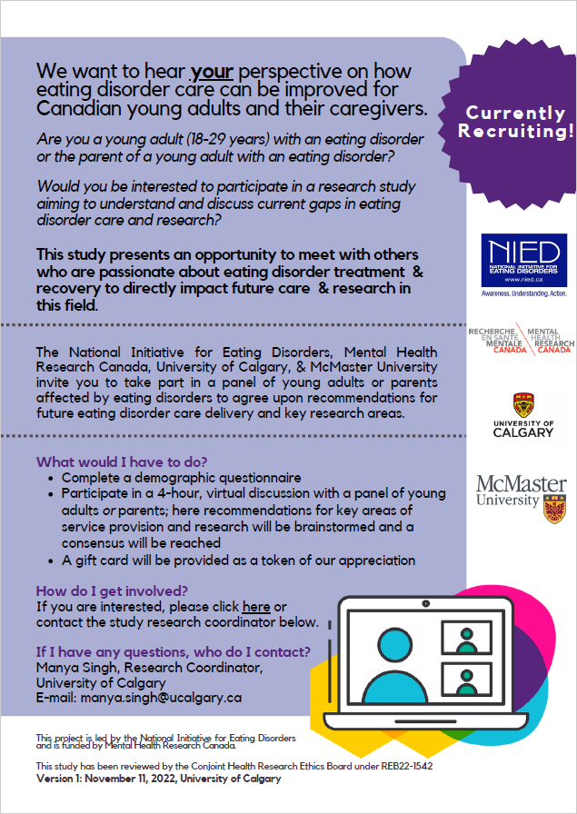Researchers from the University of Calgary, McMaster University, and Mental Health Research Canada, with the support from the National Initiative for Eating Disorders (NIED), invite you to participate in a panel of young adults or parents/caregivers affected by eating disorders to generate recommendations for future eating disorder research and care delivery!