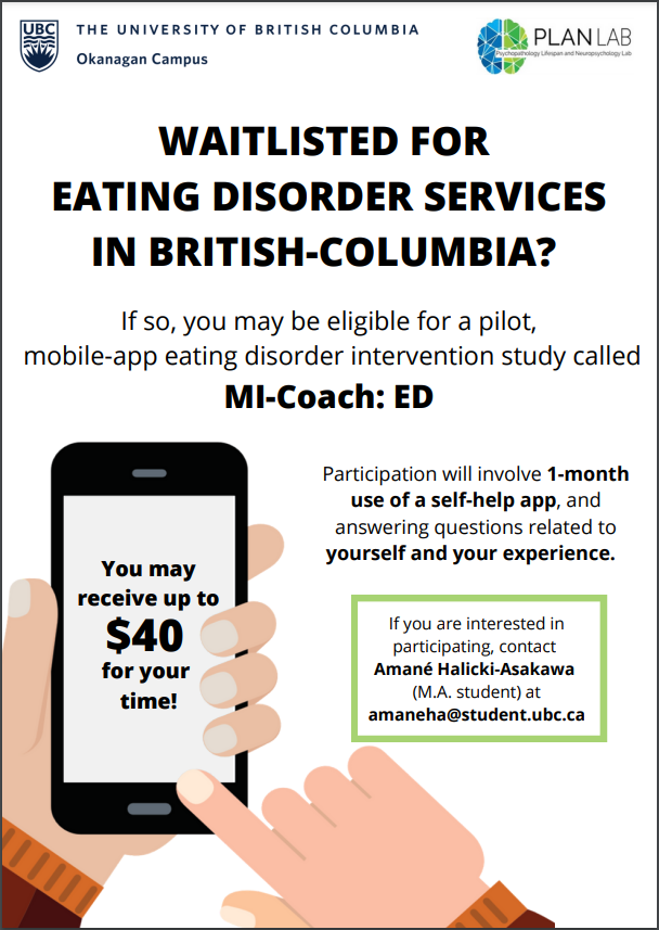 Researchers at the University of British Columbia are seeking participants for a study of a pilot test of the MI-Coach©, an app for adult women on eating disorder waitlists. They are evaluating whether the app, designed to increase motivation to recover from an eating disorder, is acceptable to participants and a feasible way to increase waitlist retention and treatment adherence.