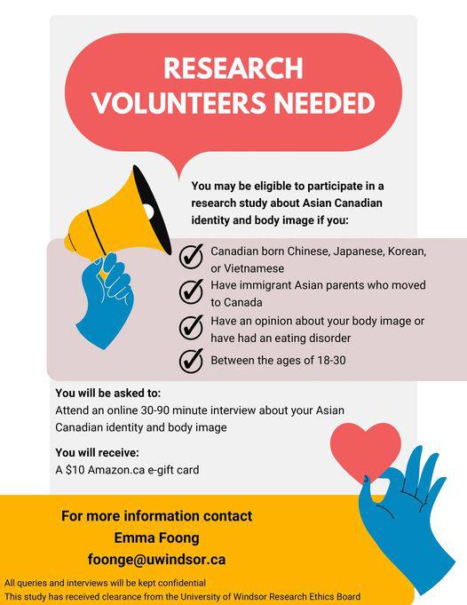 - you will be asked to attend an online 30- to 90-minute interview about your Asian Canadian identity and body image