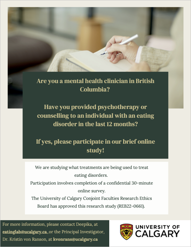 For more information, please contact Deepika at eatinglab@ucalgary.ca, or the Principal Investigator, Dr. Kristin von Ranson, at kvonrans@ucalgary.ca.
