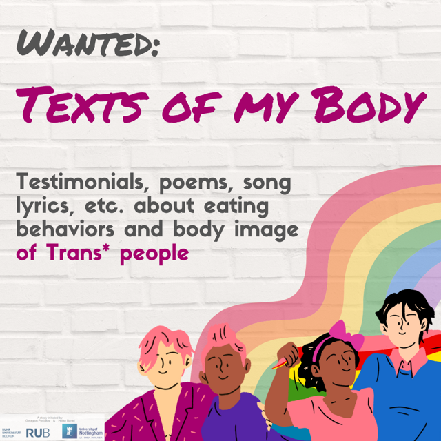 An international team of researchers (professor Georgios Paslakis, Ruhr-University Bochum, and professor Heike Bartel, University of Nottingham) is inviting trans* people to submit short testimonials, poems, descriptions of everyday life, song lyrics, raps, creative texts (any type of text and any language is welcome) about their personal experiences on the subject of body, body image, and self-esteem in connection with eating behaviors, appearance, weight, muscle mass, etc., and on all topics that are individually related to this for them.