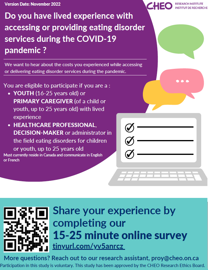 Researchers across Canada led by a team at the Children's Hospital of Eastern Ontario Research Institute (CHEO RI) are inviting those with lived experience accessing or delivering eating disorder services for youth during the COVID-19 pandemic to complete a 15–25-minute survey. You will be be asked about the costs you may have experienced.