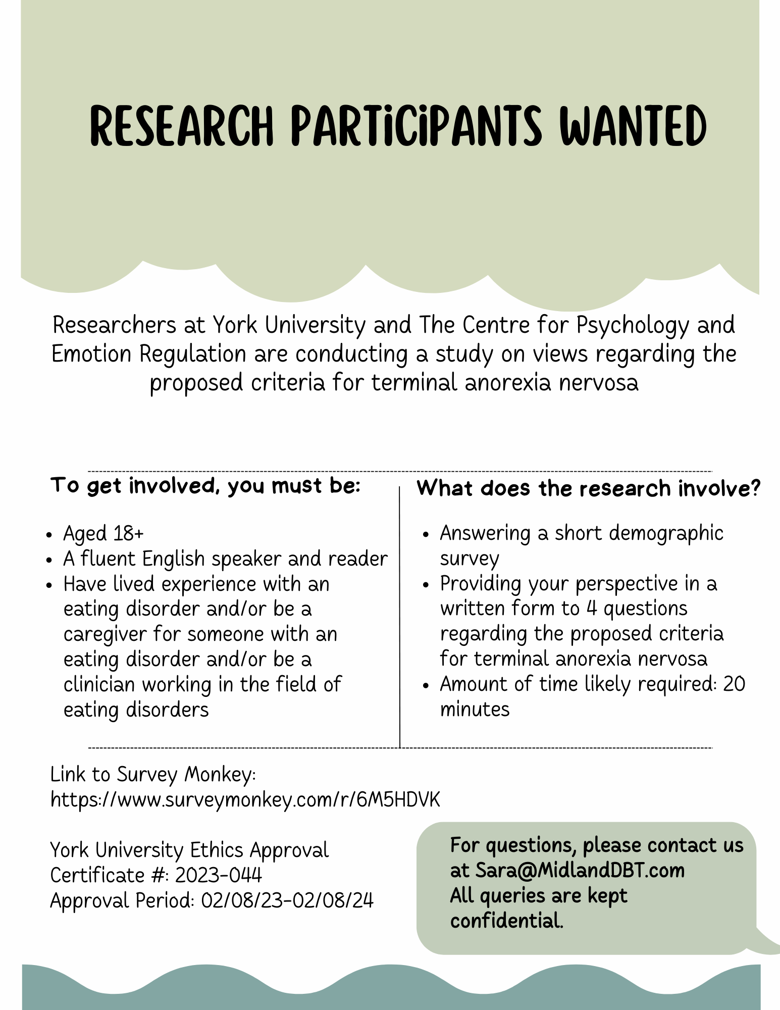 Researchers at the Centre for Psychology and Emotion Regulation and York University are conducting a study to better understand different views regarding the proposed criteria for terminal anorexia (Gaudiani et al., 2022). Such criteria have substantial implications as they will be used to identify eligibility for Medical Assistance in Dying (MAiD). Presently there is no consensus with respect to defining what constitutes palliative or terminal definitions of anorexia. Thus, this project seeks to explore how people view the proposed criteria for terminal anorexia.