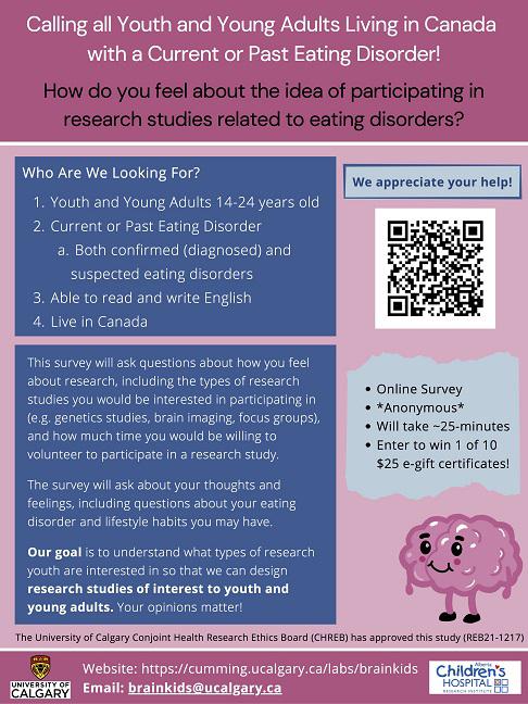 Researchers in the McMaster Lab at the University of Calgary are aiming to better understand how youth with eating disorders feel about the idea of participating in research studies. The information collected will be used to design future research studies that fulfill the interests of youth with eating disorders.