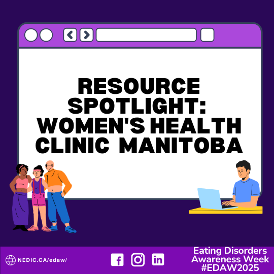 This set of four images consists of a title slide and three graphics featuring information about the ways in which the Women's Health Clinic in Manitoba is providing lower-barrier support for people affected by eating disorders and disordered eating.